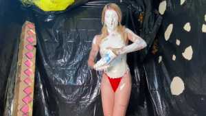 Marshmallow fluff is one of my favourite WAM messes: so sticky and shiny, and makes spider-web-like strands/tendrils when pulled. I've bought plenty of videos featuring it before (at least half of them featuring Kaydens, who appears to specialise in it, and several featuring Jayce), but probably this is one of the better ones. It doesn't feature the largest quantity of fluff ever (for that, check out some of Kaydens' and Jayce's videos where they fill a paddling pool with several buckets of it), but it ranks highly for how sticky the fluff is--it's almost solid! Having two people involved is more interesting than one, because they spend much of the video stuck together (a few times they hug to make sure this happens) and then pulling apart leaving long strands of fluff between them (I particularly like the part between about 4:45--5:00). The two women giggle a lot, obviously enjoying themselves. Allison's top and untied long hair sometimes get extra stuck and she needs to pull them away. I like the colours of the fluff; at first Kaydens covers herself in purple and Allison covers herself in white, but soon they start to cover each other, and the colours further mix together as they get stuck together. I like the outfit Kaydens wears (bra and panties according to the description, but it looks more like a bikini to me; I like seeing swimwear get wet with mess other than water, but in this case, the fluff is so solid, I'm not sure whether "wet" is the right word!), and the colours of it complement the colours of the fluff well. My only criticism is the same I have said about many WAM videos by many people: it's a pity we don't get to see the washing off afterwards (which I imagine must have been a challenge!)