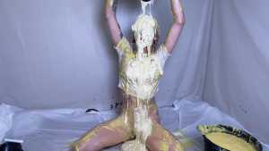 First, Kaydens gets covered head to toe in a thick coating of a huge amount of marshmallow fluff. Then when Jade enters the pool, Kaydens sticks her head up her skirt and eats her pussy, which is a bit strange, but strangely sexy. Also at this point, you can briefly see a string of fluff dripping off one of Jade's boobs. They proceed to eat each other's pussies and asses, and kiss, all while both completely covered head to toe in fluff. (I love eating pussy; I wish I were in there with them!) Later (about 13 minutes) there's a part where Kaydens is lying almost on top of Jade, first Kaydens rubs her own pussy, then Jade takes over rubbing Kaydens' pussy while Kaydens reaches up and covers Jade's face in more fluff; with them both covered and stuck together, they almost merge into one. So this video combines two beautiful women, total coverage with a huge quantity of very sticky mess, and hot lesbian sexual activities--what's not to love?
