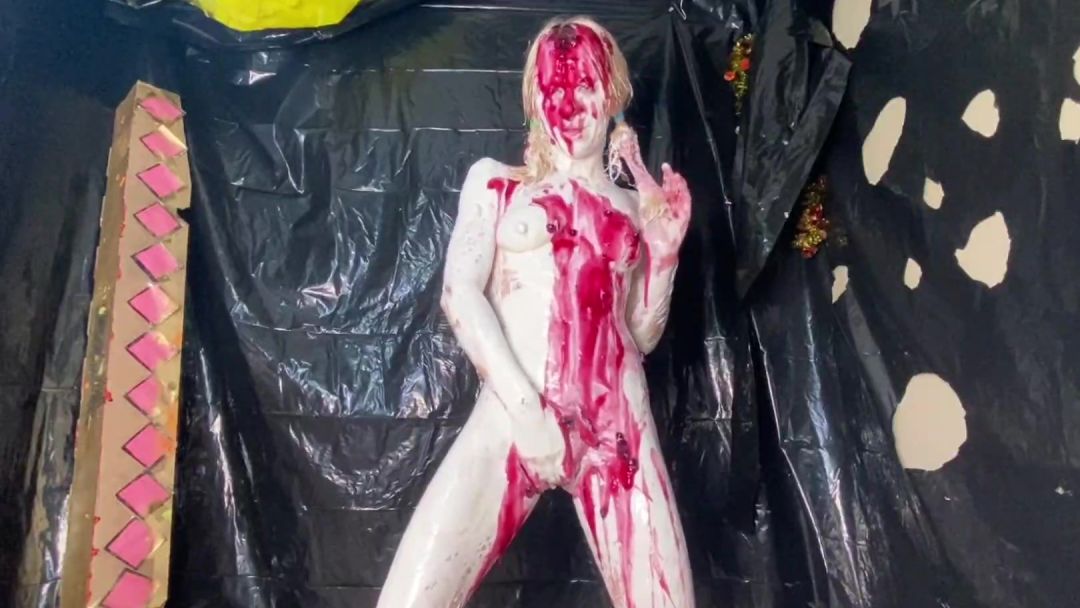 To finish off she pours a tub of cherries in sauce over herself, which yields a fantastic contrast, of mess colours with the red and white looking amazing. This turns her on even more and she wanks the cherries into her pussy from the front and the rear.