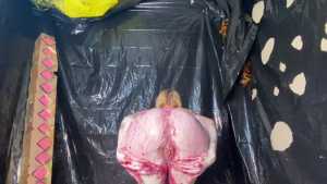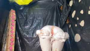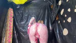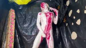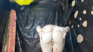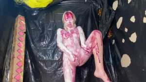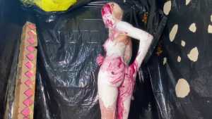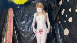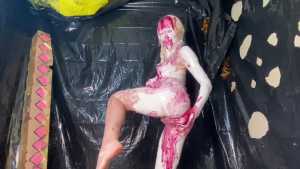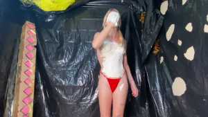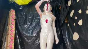 Kaydens starts out in a just a red thong, and gets straight into the action, opening a tub of marshmallow fluff and smearing it over her bare tits and whole upper half, including her face, pausing only to lick a little of the delicious fluff. She then moves on to cover her legs, before removing her thong so she can cover her pussy too, which she does eagerly...