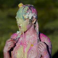 Wearing my blue velvet dress, I fill my see-through high heel boots with lucious vanilla cake batter and then slide my bare feet inside! The batter oozes out of the laces as i keep stuffing more mess into my shoes! I take them off and show off my bare feet while getting them messier and messier in cake batter! I put my shoes on again, enjoying the lucious mess in between my toes!