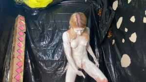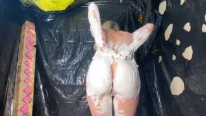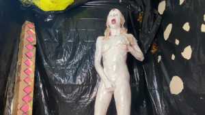 Kaydens, completely covered in sticky shiny white marshmallow fluff, first masturbates with her hand at the same time as sucking a dildo, then using the dildo in two different positions. Near the end, she sucks the dildo while both it and her are completely covered in fluff. Overall, this video differs from many other fluff videos in featuring less moving around, but that's not a bad thing; it's enjoyable to see Kaydens just lying, sitting and kneeling (in a few different positions at different times) having very sexy fun.