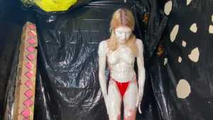 Marshmallow fluff is one of my favourite WAM messes: so sticky and shiny, and makes spider-web-like strands/tendrils when pulled. I've bought plenty of videos featuring it before (at least half of them featuring Kaydens, who appears to specialise in it, and several featuring Jayce), but probably this is one of the better ones. It doesn't feature the largest quantity of fluff ever (for that, check out some of Kaydens' and Jayce's videos where they fill a paddling pool with several buckets of it), but it ranks highly for how sticky the fluff is--it's almost solid! Having two people involved is more interesting than one, because they spend much of the video stuck together (a few times they hug to make sure this happens) and then pulling apart leaving long strands of fluff between them (I particularly like the part between about 4:45--5:00). The two women giggle a lot, obviously enjoying themselves. Allison's top and untied long hair sometimes get extra stuck and she needs to pull them away. I like the colours of the fluff; at first Kaydens covers herself in purple and Allison covers herself in white, but soon they start to cover each other, and the colours further mix together as they get stuck together. I like the outfit Kaydens wears (bra and panties according to the description, but it looks more like a bikini to me; I like seeing swimwear get wet with mess other than water, but in this case, the fluff is so solid, I'm not sure whether "wet" is the right word!), and the colours of it complement the colours of the fluff well. My only criticism is the same I have said about many WAM videos by many people: it's a pity we don't get to see the washing off afterwards (which I imagine must have been a challenge!)
